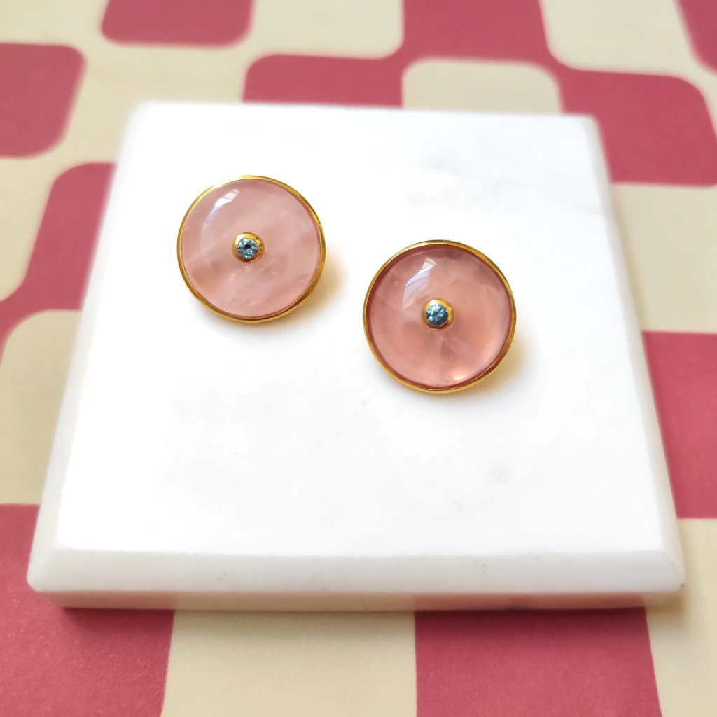 Brinco em prata 950 com acabamento fosco e detalhes polidos na virola da pedra. Pedra quartzo rosa com lapidação manual e exclusiva com Aprox. 2,2cm de diâmetro e detalhe interno em topázio azul Swiss com 4mm.
