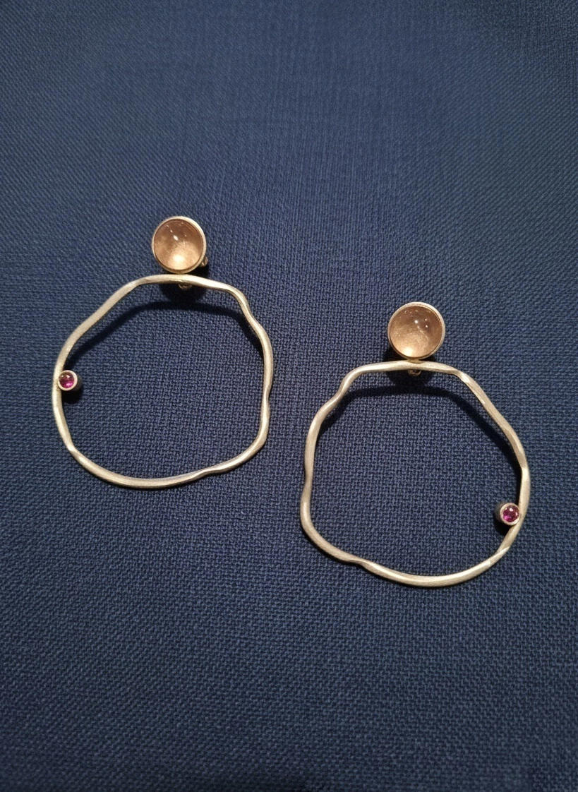 Brinco em prata 950 com acabamento fosco acetinado. Pedra quartzo rosa com 10mm de diâmetro e rodolita pink em lapidação diamante com 3mm de diâmetro. Diâmetro total do brinco: 5,5cm Feito a mão
